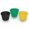 Vasos cachepot coloridos em formato circular, apresentados em verde, laranja e preto, com detalhes na borda e suas variações de cores. Vasos cachepot coloridos em formato circular, apresentados em verde, laranja e preto, com detalhes na borda e suas variações de cores.